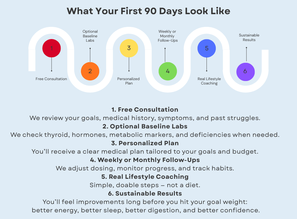 We titrate very slowly and personalize your dose to your comfort level. You’ll have direct support if side effects appear, and we have multiple strategies to manage nausea or GI issues.