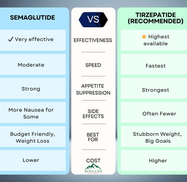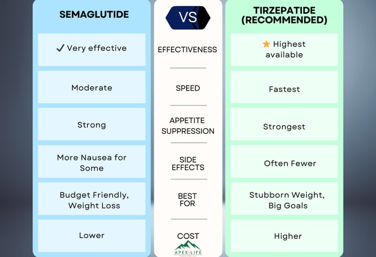 Semaglutide remains one of the most widely used weight-loss medications for a reason: it works. It may be slower than Tirzepatide, but it is still highly effective, especially when combined with Apex coaching and consistent follow-up. At Apex, we offer Semaglutide because it works but most patients choose Tirzepatide for stronger, faster results.